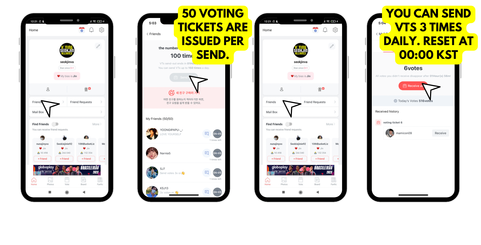 Daily tickets 🎟️ are given automatically to each account holderℹ️The higher the rank, the more voting tickets received(Tickets are not visible but the amount of tickets will reflect when you are about to vote)